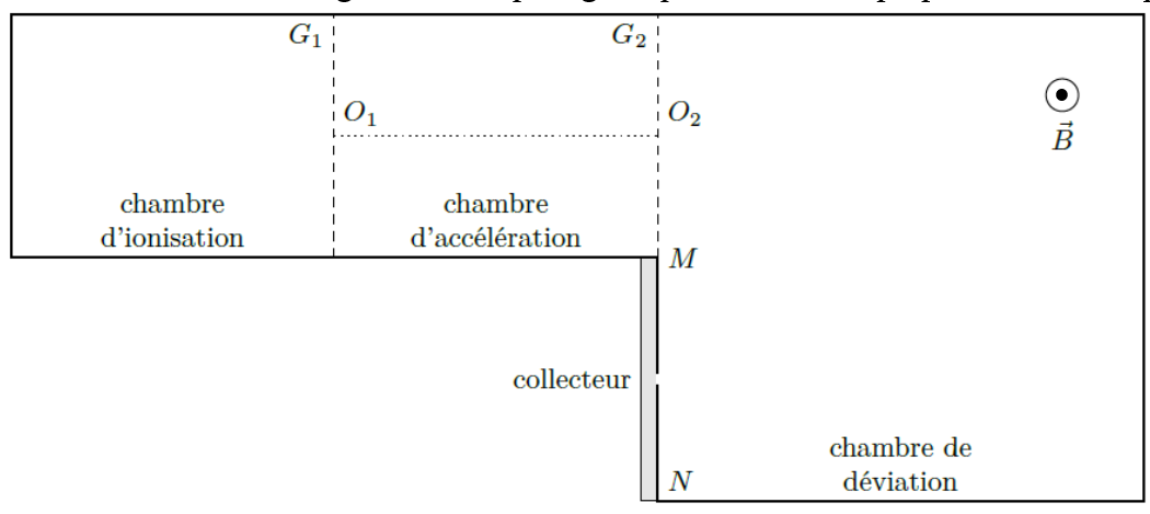 On cherche à séparer les deux isotopes de l’uranium que sont 235U et 238U. Ils sont au préalable ionisés dans la chambre d’ionisation pour former des cations U+. Ils pénètrent dans la chambre d’accélération en O1 . Ils y sont soumis à un champ électrique horizontal uniforme et permanent . Ils pénètrent alors en O2 dans la chambre de déviation où règne un champ magnétique uniforme perpendiculaire au plan de figure.